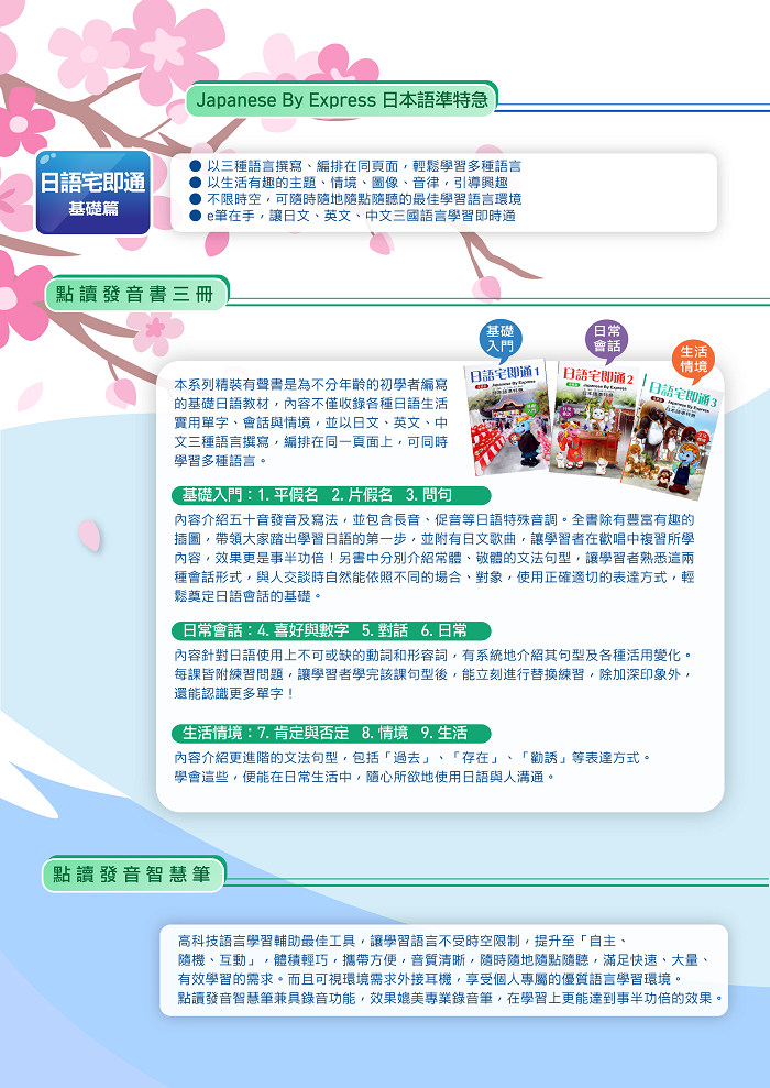 本系列精裝有聲書是為不分年齡的初學者編寫的基礎日語教材,內容不僅收錄各種日語生活實用單字、會話與情境,並以日文、英文、中文三種語言撰寫,編排在同一頁面上,可同時學習多種語言。